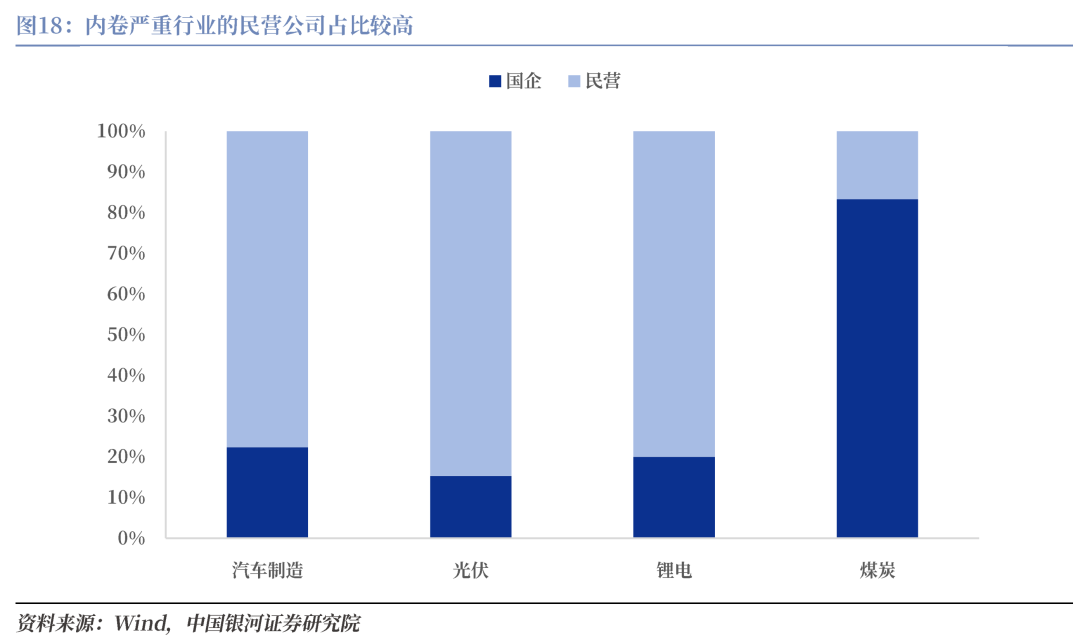 从行业类型来看,在上一轮供给侧改革中,还呈现三个特点:一是以国央企为主,据国新办2018年前三季度央企经济运行情况发布会披露,国有企业承担了约80%的去钢铁产能任务和70%的去煤炭产能任务;二是聚焦上游行业,无论是钢铁、水泥、电解铝还是平板玻璃都属于上游产业,在上轮2016 年启动的棚改货币化强刺激过后,带动短暂需求高增,但新建产能无法消失,导致供需错配;三是主要行业产品同质化严重,上游行业相对于下游行业产品差异化极小,带来的结果是,在其他条件相同的情况,产能去化难度降低。而本轮“内卷式”竞争民企占比较高,从当前可能涉及“内卷式”竞争行业来看,大多数行业民营公司占比超过50%,以内卷程度较严重的光伏、新能源为例,民营企业占比均超过70%,且上中下游产业均涉及,产品的差异化程度也比上一轮供给侧改革的行业高。