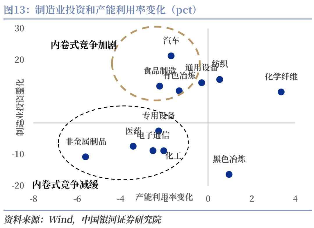 其次,比较制造业投资和产能利用率,投资会形成未来的产能,因此我们能够从产能利用率与投资的动态来窥探内卷式竞争对企业投资决策的影响。在市场出清机制有效作用下,较低的产能利用率会限制企业扩张的进度,从而降低投资增速。但在内卷式竞争下,产能利用的不足难以延缓企业扩张的步伐,二者呈现出反向变化。在这一状况下,企业的内卷式竞争将会呈现出持续加剧的态势。因此图13中,第二象限代表内卷竞争加剧的行业;而第三象限代表投资增速低于均值,内卷式竞争或有所缓解。