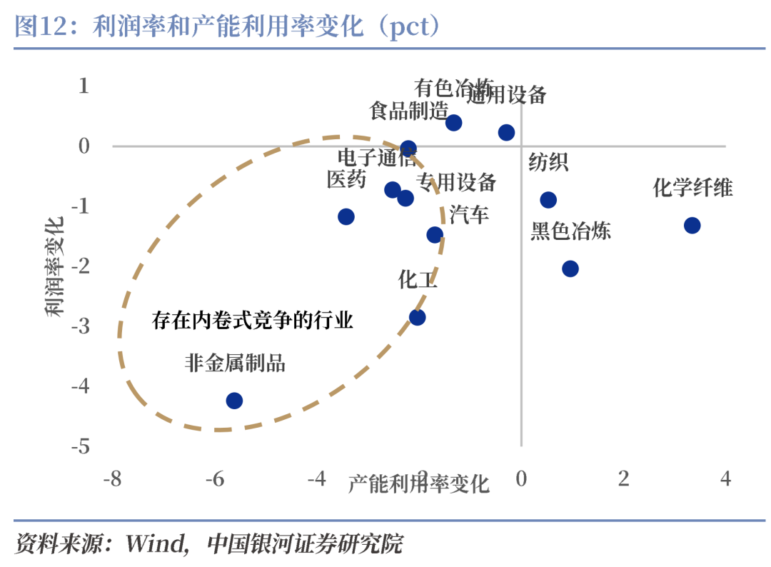 首先,比较利润率和产能利用率,内卷式竞争意味着更低的利润率和产能利用率,如果通过公式测得利润率变化为负值,则证明目前该行业的利润率较历史正常水平有所恶化;产能利用率同理,如果录得负值,证明目前行业闲置产能高于历史均值。因此如果利润率变化和产能利用率变化都处在负值,则证明行业可能存在内卷的情况,位于图12中的第三象限。可以看到在这一定义下可能存在内卷式竞争行业为电气机械、医药、食品制造、专用设备、电子通信、汽车、化工、非金属制品等行业。不过该二维对比仅推测可能存在内卷式竞争的行业,我们需要更多信息确认。