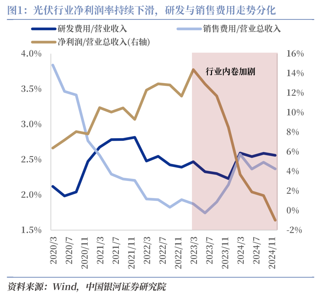 从企业层面看,主要表现为同质化价格战挤压技术创新投入。需明确的是,单纯价格战并非内卷式竞争,其核心特征在于,在利润率持续走低的情况下仍盲目投资、扩大生产,将本应用于技术研发、产品升级、模式创新的资源,大量转移至维持生存的销售费用、非生产性成本(如过度公关)或重复低效投资,导致核心竞争力难以提升。以光伏产业为例,其净利润率自2023年初(14.37%)以来快速下滑,2025年降至-1%。同一时期,销售费用率整体呈上升趋势,且涨幅超过研发费用率;产业整体投资仍保持扩张态势,2024年四季度投资活动现金流出超2000亿元。