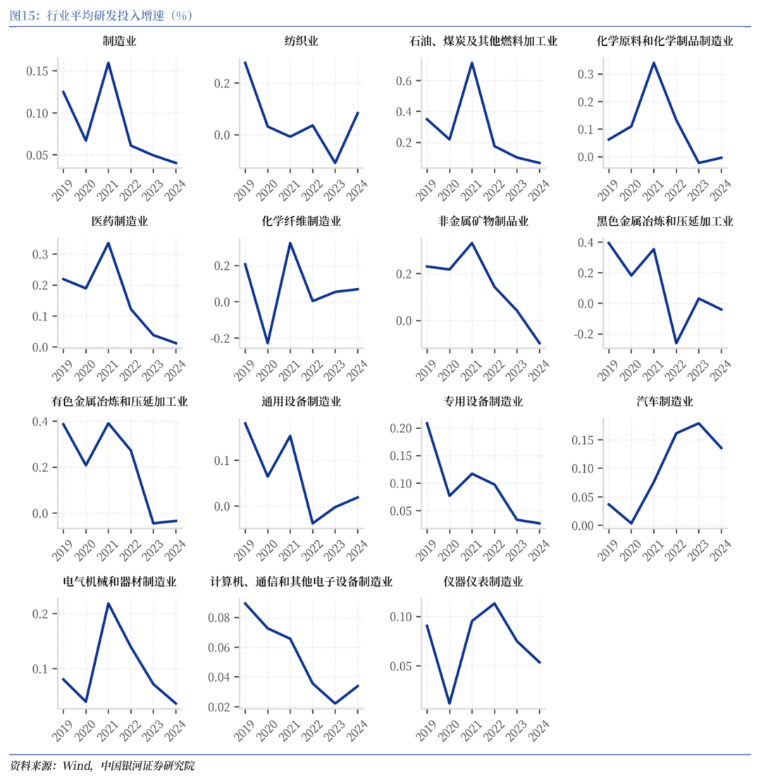 研发投入是衡量一个行业或企业是否具备长期竞争力的重要指标。当行业陷入“内卷式”竞争时,企业往往将资源集中在短期生存和市场份额争夺上。而往往研发回报由于周期长、风险高等因素,导致企业牺牲研发投入。然而反过来,研发投入不足会导致产品同质化严重,使得行业更容易陷入价格战和产能扩张的恶性循环,进一步加剧“内卷”。我们通过上市公司SAC国民经济分类中的各行业平均研发投入增速来观察行业趋势。总体上制造业在过去三年间研发投入大幅下滑,从2021年的15.9%下滑到2024年的4%。其中石油煤炭、化学原料、非金属矿物制品、医药制造以及有色冶炼均有较大幅度下降。不过汽车行业较为例外,虽然上文已经表明汽车行业内卷程度较高,作为新旧动能转换的主要抓手之一,新能源汽车再过去几年中发展较为迅速,致使汽车行业连续三年研发投入增速高于10%。