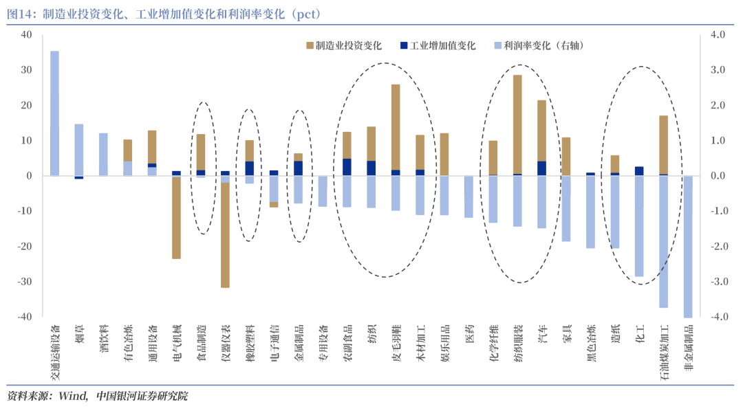 上文我们通过产能利用率来观测行业“内卷”的情况,不过国家统计局仅公布12个行业的产能利用率,无法全面反映 31个制造业行业的整体情况。因此我们选择用制造业投资、工业增加值和利润率三个指标共同比对进行观测,这三个指标均包含31个行业数据。