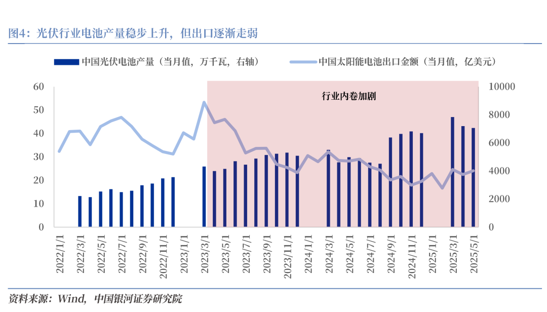 一是供需结构错配,导致产能扩张与需求增长脱节,加剧了同质化竞争与创新动力不足的问题。一方面,部分新兴行业发展初期因技术路线不确定引发过度投资,导致产能增速高于需求增长,技术成熟后市场趋于饱和,同质化竞争加剧。另一方面,高质量供给存在短板,在高端芯片、精密仪器、核心工业软件等关键领域,有效供给能力不足,难以满足消费升级和产业升级需求,导致国内消费增长乏力;同时受全球经济放缓影响,外部需求疲弱,部分行业面临需求端压力。以光伏行业为例,自2023年初以来,出口金额持续下滑,而产量却保持增长,企业面临更大的销售压力。部分国内企业通过价格竞争应对外部需求疲软,进一步削弱了创新动力。